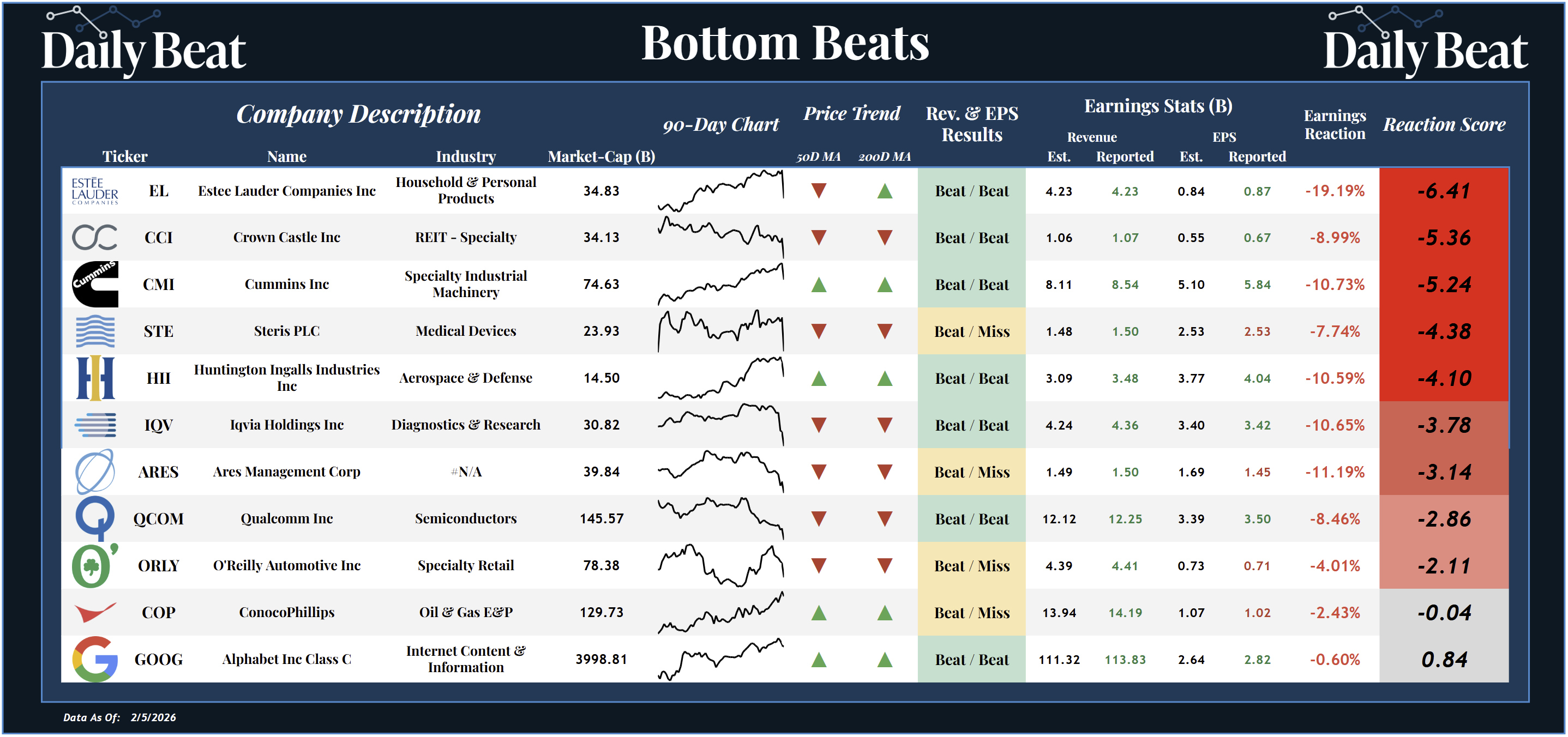 Earnings season is the heartbeat of the market, and every day brings fresh signals about where money is flowing. With each report, we learn not just how companies are performing, but how investors are reacting. In the Daily Beat, we spotlight the most important S&P 500 earnings moves from the prior session: the winners, the losers, and the reactions that reveal what really matters to the market right now. Whether it's a bellwether with broad economic implications or a niche name making waves, we cut through the noise to focus on the setups that matter most. |