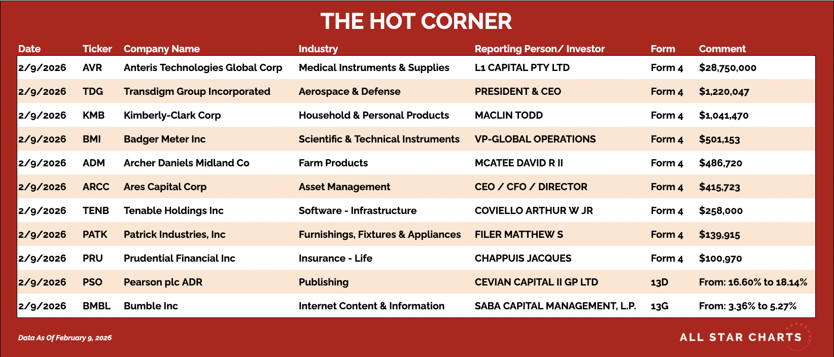 Every day, we sift through the filings to spot where the real conviction lies – cutting through the noise to highlight the most meaningful insider moves. 📌 Anteris Technologies Global Corp $AVR — L1 Capital purchased $28.75 million via Form 4. An anchor-position investment in a small-cap medical device name building out a multi-month base. 📌 Pearson $PSO — Cevian Capital increased its stake from 16.60% to 18.14% via 13D. Continued activist-style accumulation as the stock retests a prior base breakout area, a key polarity zone where former resistance is attempting to turn into support. Here's The Hot Corner, with data from February 9, 2026: |