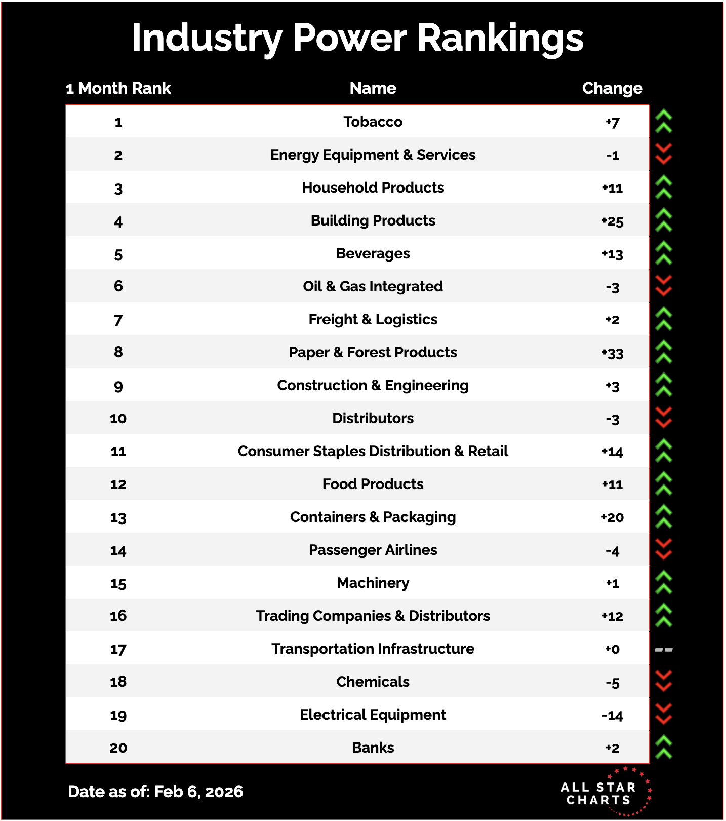 The Industrial sector closed at fresh all-time highs across large-, mid-, and small-cap names. Relative strength is exceptionally strong, with multiple groups showing broad participation. Here's a look at our overall industry rankings, which show Building Products stocks jumping into the fourth spot