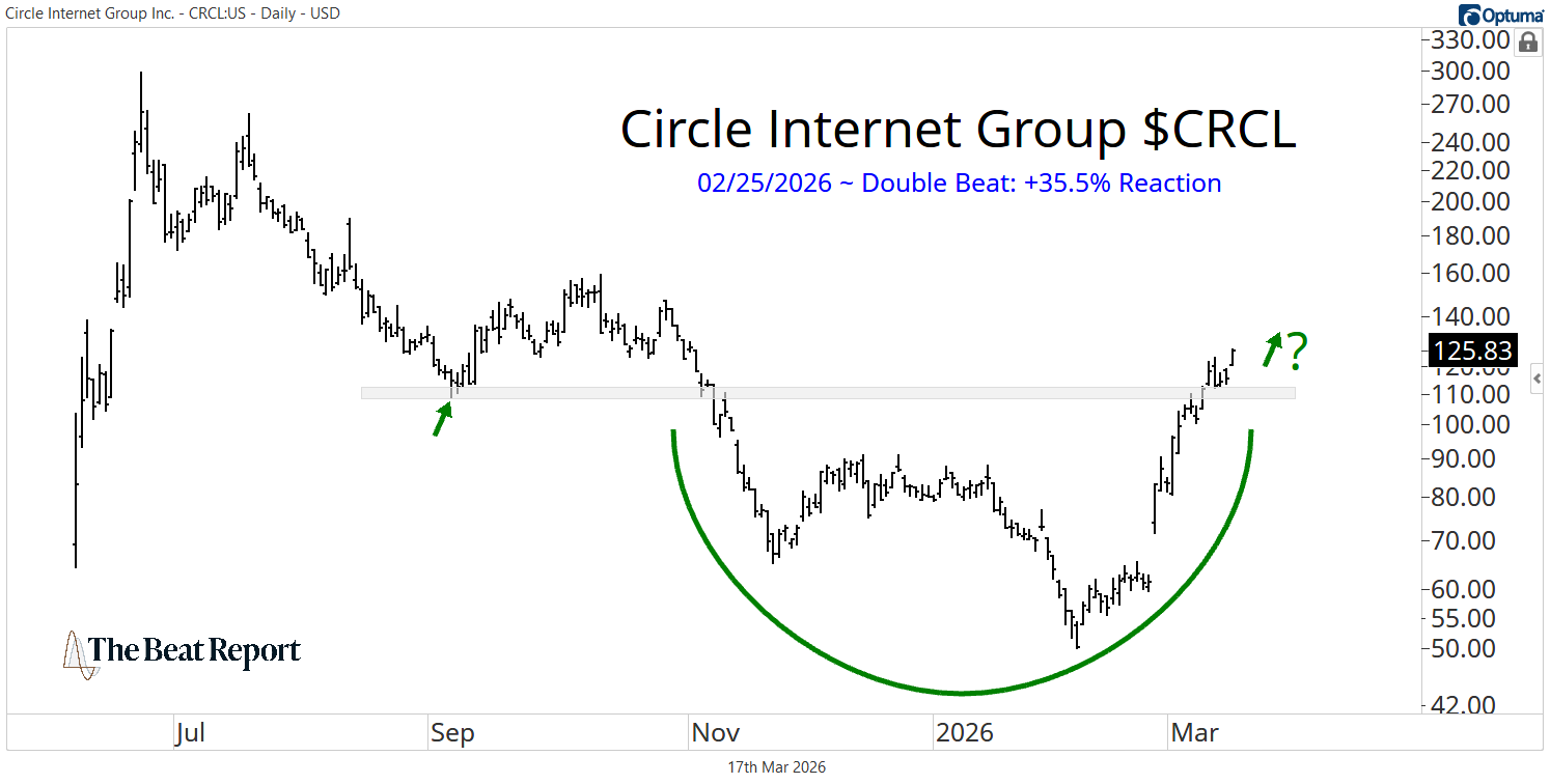On February 25, CRCL delivered a double beat and rallied +35.5% for its best reaction ever.