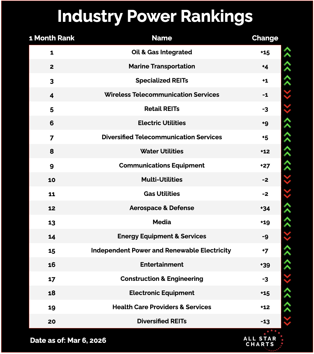 The Technology sector has been a bright spot, offering a degree of stability in an otherwise rough tape so far in March. The sector is digging in and refusing to break down on both an absolute and relative basis. With the broader market looking to establish a tradable low, evidence is mounting that big tech stocks will lead it out of this corrective wave. Here's a peek at our overall industry rankings, which shows Electronic Equipment moving up 15 spots and breaking into the top 20.