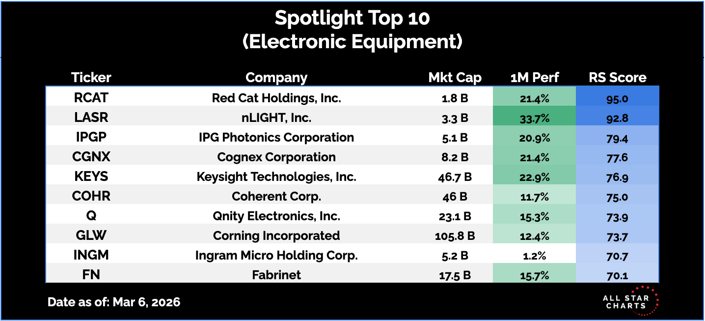 Here are the Top 10 names in the Electronic Equipment subsector, ranked by relative strength. |